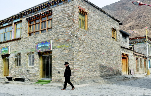 3月9日,在称多县拉布乡拉司通村,尼玛从一处震后新建的民居前经过。 |