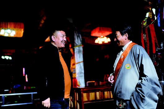 3月9日,在称多县拉布乡拉司通村,尼玛(左)和巴才仁商量打造游客接待中心的计划。 |