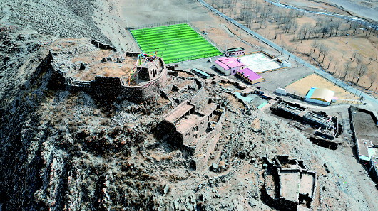 3月9日,在称多县拉布乡郭吾村,尼玛在郭吾古堡内寻访(无人机照片)。 |