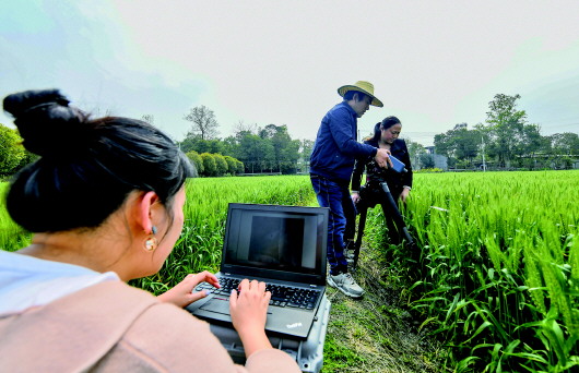 在成都温江农业气象试验站,技术人员使用成像光谱仪做小麦光谱观测(3月16日摄)。