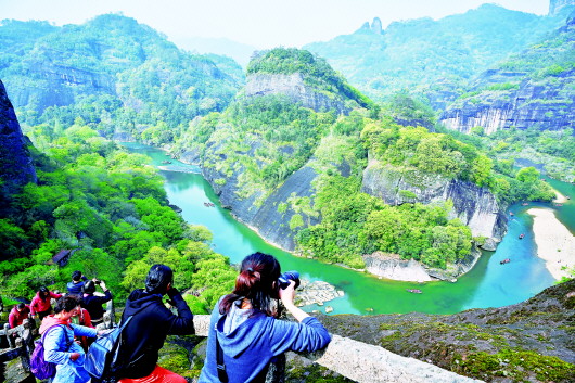 3月22日,游客在武夷山国家公园天游峰景区游览拍照。