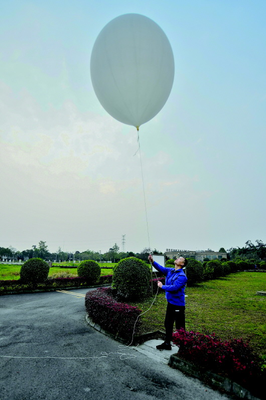 在成都温江国家气候观象台,气象观测工程师陈建将探空气球的线绳延长到一定高度等待放飞(3月16日摄)。