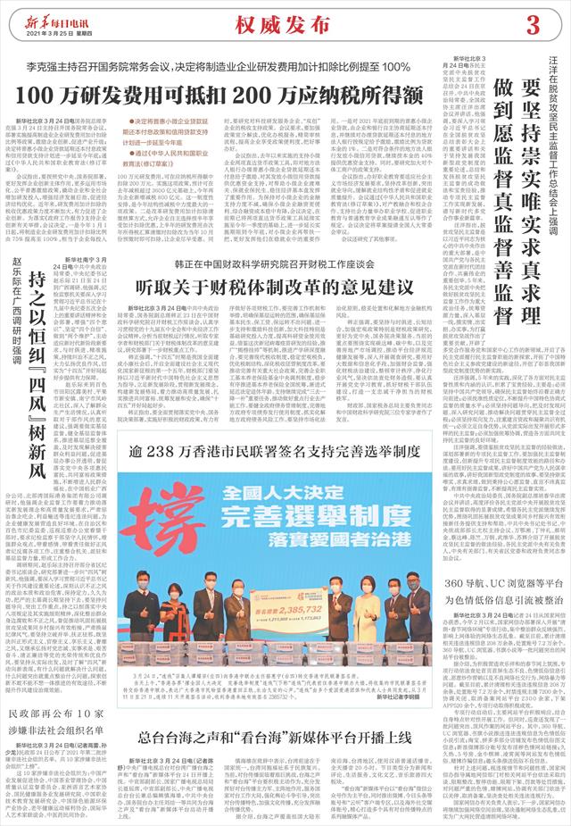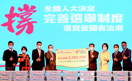 当天上午,“香港各界‘撑全国人大决定 完善选举制度’连线”(下称“连线”)代表前往香港中联办大楼,将收集的市民联署签名册转交给香港中联办,表达广大香港市民盼望香港重回正轨、长治久安的心声。“连线”由多个爱国爱港团体和代表人士共同发起,从3月11日至21日,连续11天开展签名活动,收到香港本地有效签名2385732个。 新华社记者李钢摄