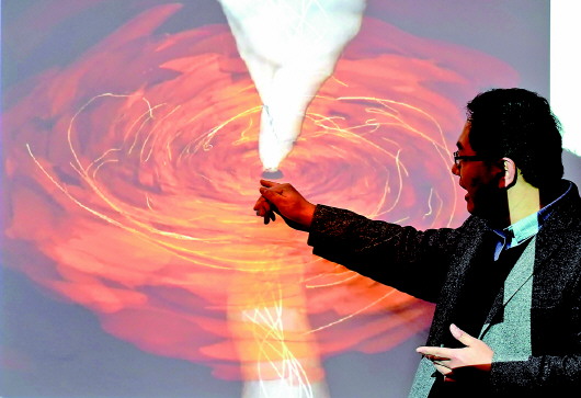 3月24日,中国科学院上海天文台路如森研究员介绍黑洞的相关知识。 新华社记者张建松摄 |