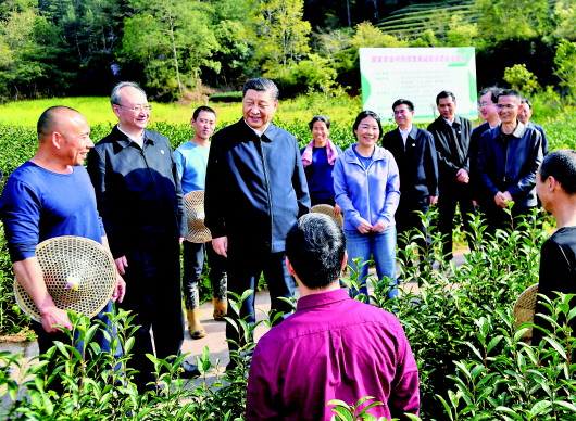 武夷山是乌龙茶、红茶的发源地。习近平来到星村镇燕子窠生态茶园,察看春茶长势,了解当地茶产业发展情况。习近平强调,要统筹做好茶文化、茶产业、茶科技这篇大文章,坚持绿色发展方向,强化品牌意识,优化营销流通环境,打牢乡村振兴的产业基础。要深入推进科技特派员制度,让广大科技特派员把论文写在田野大地上。