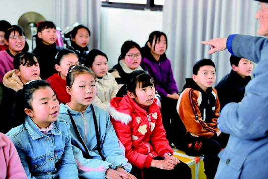 3月23日,严明友在朱湾小学音乐教室里教孩子们唱歌。 |
