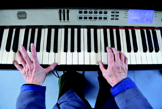 3月23日,严明友在朱湾小学音乐教室里弹奏电子琴。