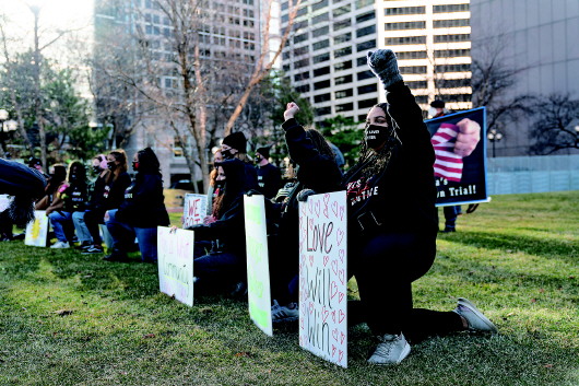 3月29日,抗议者在位于美国明尼阿波利斯市的法庭外展示标语。