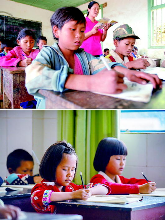 上图:2003年6月13日,云南省澜沧拉祜族自治县木戛乡哈卜吗村小学的学生张娜而(左一)在教室里上课(新华社记者秦晴摄);下图:2021年3月3日,张娜而的女儿罗娜努(中)在哈卜吗村小学二年级的课堂上(新华社记者江文耀摄)。