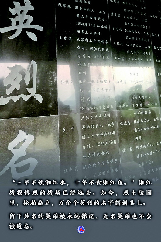 “三年不饮湘江水,十年不食湘江鱼。”湘江战役惨烈的战场已经远去。如今,烈士陵园里,松柏挺拔,石碑静静矗立,万余个英烈的名字镌刻其上。