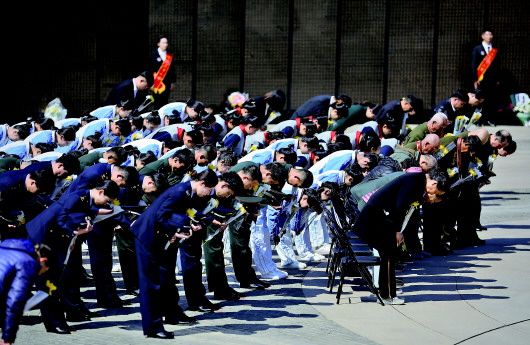 4月4日,志愿军老战士代表和祭扫者代表向烈士英名墙鞠躬祭拜。