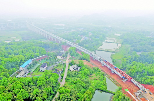 4月5日,由中铁十一局承建的常(德)益(阳)长(沙)铁路6标动走左线特大桥最后一片T梁成功架设。至此,常益长铁路480片T梁架设全部完成,为日后的铺轨施工打下坚实基础。常益长铁路全长157公里,设计时速350公里,是国家“八纵八横”高速铁路网的重要组成部分。 新华社记者赵众志摄