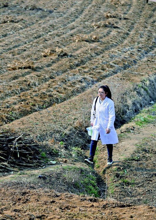 4月6日,在辽宁省东港市前阳镇前阳村,孙艺走在乡间小路上,去患者家随访。 |