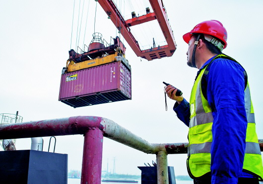 武汉国际集装箱有限公司船舶作业调度员徐敏在武汉新港指挥作业(3月29日摄)。千千万万平凡岗位上的劳动者,为荆楚大地的复苏默默贡献力量。 新华社记者肖艺九摄