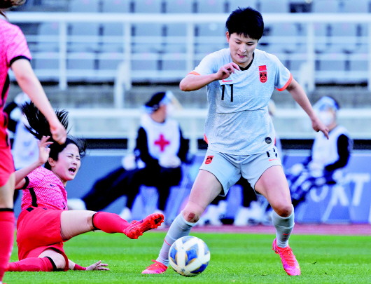 4月8日,中国队球员王珊珊(右)带球过人。当日,在韩国高阳举行的东京奥运会女足亚洲区预选赛附加赛首回合的比赛中,中国队客场以2比1战胜韩国队。双方次回合比赛将于4月13日在苏州奥体中心举行。 新华社发(徐儒锡摄) |
