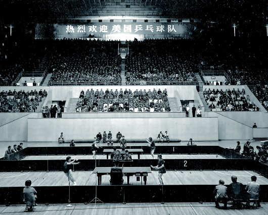![]() 1971年4月13日,中华全国体育总会举行欢迎仪式,欢迎前来中国进行访问的美国乒乓球代表团。中美两国乒乓球运动员在北京首都体育馆进行了友谊比赛。1971年-1972年,中、美两国乒乓球队互邀访问,开启了中美友好交往的大门,这在中美两国关系史上被誉为“乒乓外交”。(新华社资料照片) |