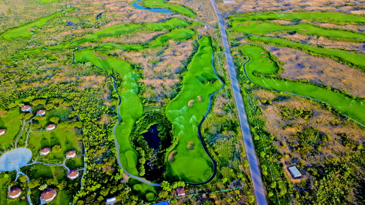 这是位于库布其沙漠中的七星湖景区(2018年7月11日摄,无人机照片)。新华社记者彭源摄