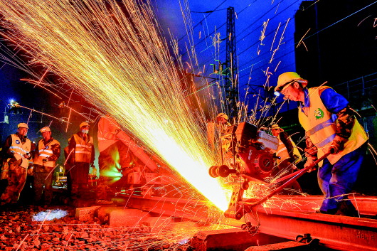4月12日,在胶济铁路黄台站,中铁十局的工作人员在进行胶济铁路至济青高铁联络线黄台站改施工作业。当日,经过6个小时的封锁要点施工,中铁十局涵盖工务、信号、通信、信息、电力、电牵6个专业的千余名工作人员,圆满完成胶济铁路至济青高铁联络线黄台站改施工作业。黄台联络线建成后,将实现济南西站、济南站、济南新东站的互联互通,京沪高铁、石济客专、郑济客专和济青高铁实现牵手成网。 新华社记者郭绪雷摄