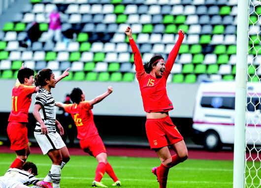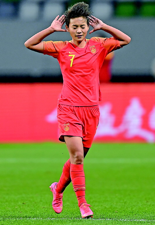 4月13日,中国队球员王霜在比赛中庆祝进球。新华社记者季春鹏摄