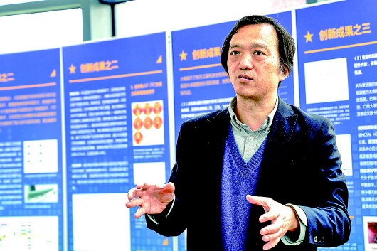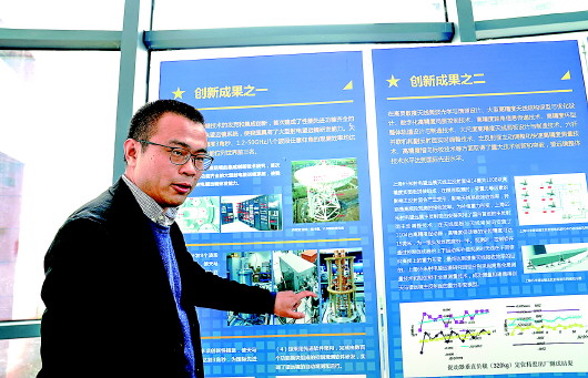 4月14日,上海天文台高级工程师仲伟业在介绍自主研发的相关观测设备。 新华社记者张建松摄 |
