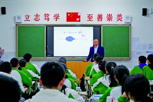 4月20日,在四川省南充市仪陇中学,黄国平高中时的班主任饶彬给学生上化学课。