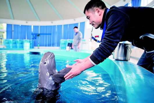 2018年11月13日,中科院水生所武汉白鱀豚馆饲养员对长江江豚进行医疗护理训练。 新华社记者肖艺九摄 |