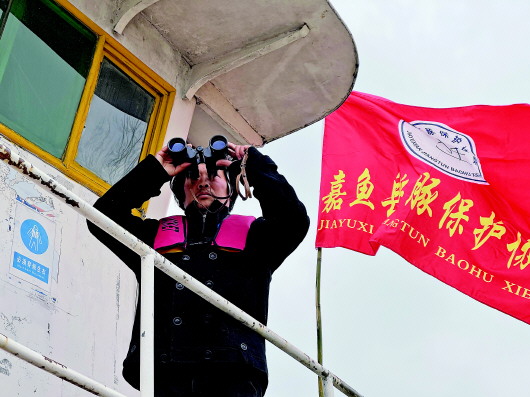 3月10日,嘉鱼县江豚保护协会会长赵世锦正在用望远镜“搜索”江面上的情况。 本报记者王自宸摄 |