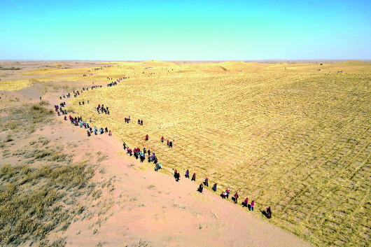 今年春季刚至,在甘肃省民勤县境内的腾格里沙漠,上千名义务治沙的干部群众在巨网般的麦格方田里,一锹土、一桶水……不断向大漠深处迈进。