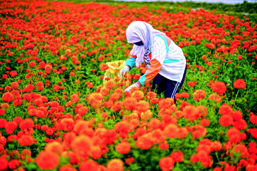甘肃省民勤县苏武镇农民在采摘万寿菊(2019年8月30日摄)。 新华社记者聂建江摄