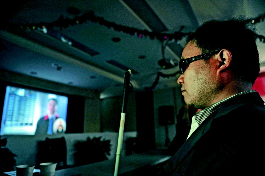 2013年4月10日,安徽合肥一名盲人在欣赏无障碍电影。 新华社发(资料片)