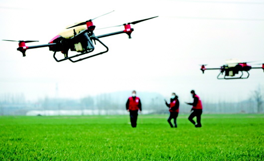 在山东省枣庄市市中区税郭镇野岗埠村,工作人员使用植保无人机在麦田里喷洒除草剂(2月27日摄)。   新华社发(孙中喆摄)