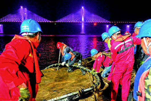 5月1日,国网福建电力海缆抢修人员将抢修好的电缆搬到船边准备吊入海底。