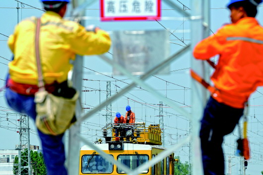 5月1日,中铁四局电气化公司施工人员在安徽合安外绕线进行接触网冷滑试验。