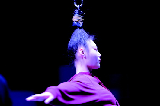 翠绿竹海幽林间,划过一位红裙少女的身影,或旋舞、或飞天,“霓裳曳广带,飘浮升天行”。不同寻常的是,舞台中央的她仅借力于头顶的一束头发。