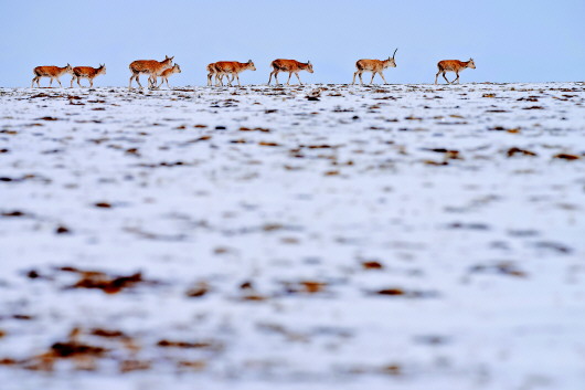 藏羚羊迁徙是世界上最为气势恢宏的有蹄类动物大迁徙之一。雌性藏羚羊在每年11月至12月交配后,于次年5月开始前往可可西里卓乃湖、太阳湖等地产仔,7月至8月产仔结束后陆续返回原栖息地与雄羊合群。