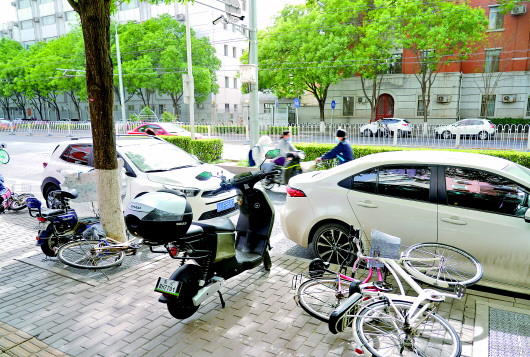 5月6日,在北京市西城区长椿街,路边停放的自行车被大风吹倒。