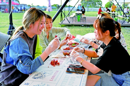 游客在品尝清水小龙虾。浙江湖州市南浔区石淙镇举办花海龙虾节,积极推进旅游与文化、农业融合发展,助力乡村振兴。目前石淙镇共有5000多亩农田采用水稻与小龙虾生态共养模式。 新华社记者