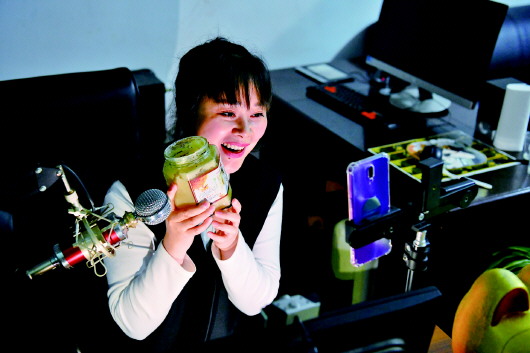 袁小梅通过网络平台在直播推介她的土蜂蜜。 |