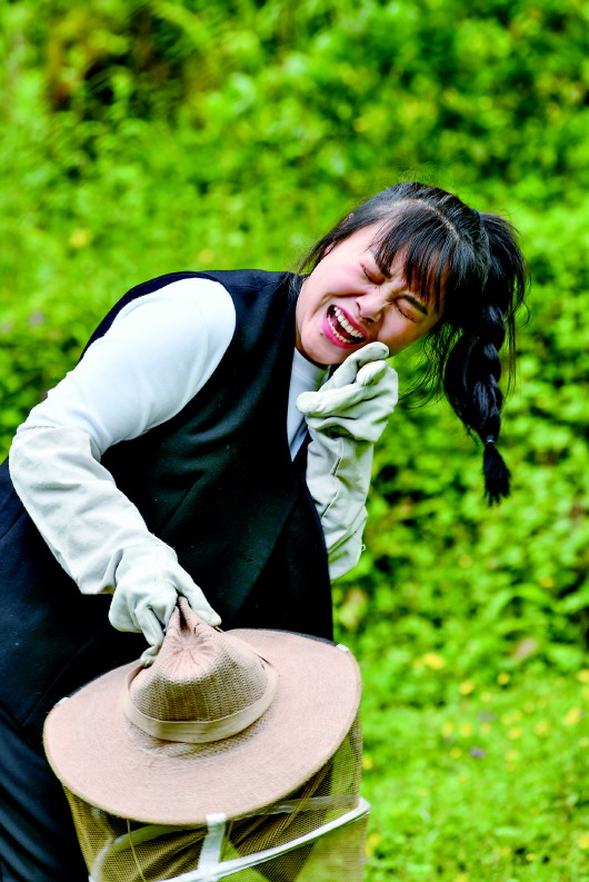 袁小梅在检查蜂箱时不慎被蜜蜂蛰伤鼻子(均为4月28日摄)。 新华社记者杨文斌摄影报道 |
