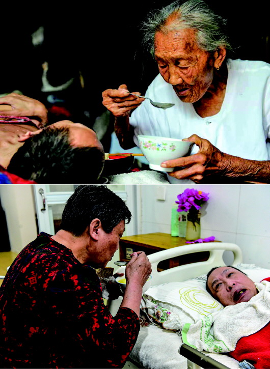 右图:5月7日,许长琴的女儿张秋露给许金义喂午饭。 新华社记者周牧摄