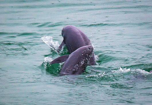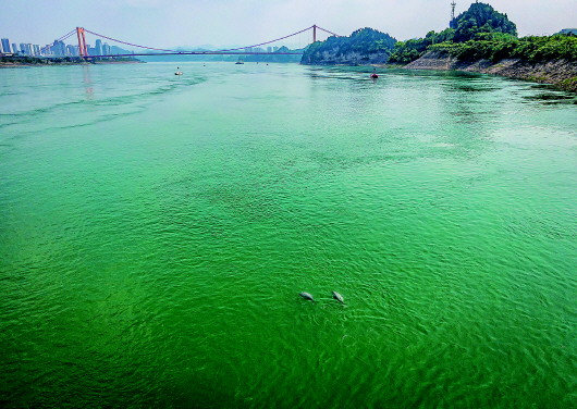 在湖北省宜昌市江边,长江江豚在水中嬉戏。近日,长江宜昌江段葛洲坝下游附近出现成群长江江豚。据当地渔政部门推测,截至目前,长江宜昌江段江豚有2至3个族群,数量约为17头。在2015年之前,长江宜昌江段江豚数量仅为2至3头。