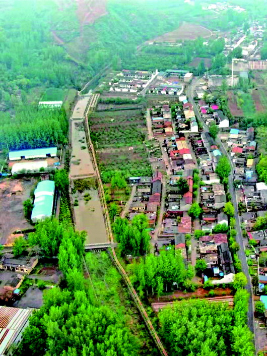 河南省“全国文明村”河口村人工湿地污水流入的燕沟河(4月25日摄,无人机照片)。
