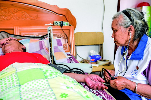 王秋姣(右)上门给行动不便的村民体检(5月11日摄)。