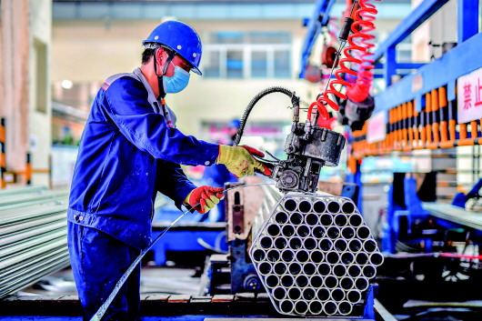 工人在由天津转移而来的唐山正元管业有限公司车间内打包管材(5月7日摄)。