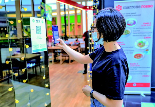 5月13日,哈萨克斯坦首都努尔苏丹市民在一家餐厅门口扫描健康码识别健康状况。 新华社发(奥斯潘诺夫摄)