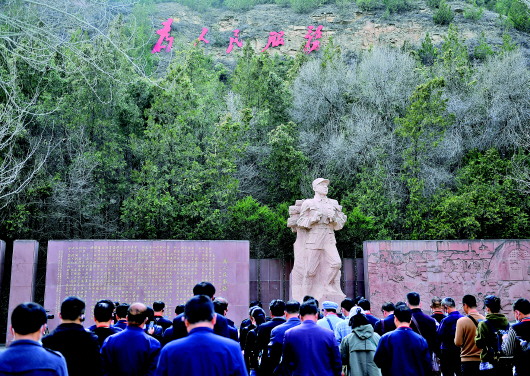出延安城,车行40里,便至安塞区高桥镇洛平川村。张思德牺牲的炭窑外,来自四川的游客李庆珂献上花篮。