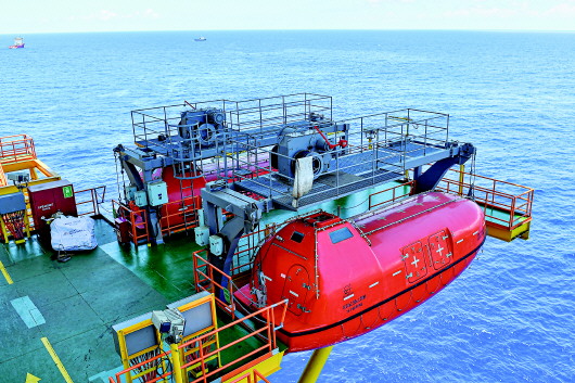 在位于海南岛东南陵水海域的“深海一号”能源站上拍摄的救生艇(5月12日摄)。“深海一号”能源站是我国自主研发建造的十万吨级深水半潜式生产储油平台,该气田是我国首个1500米深水自营大气田,探明天然气储量超1000亿立方米。“深海一号”能源站最大储油量约2万立方米,将用于该气田的开发。 新华社记者蒲晓旭摄