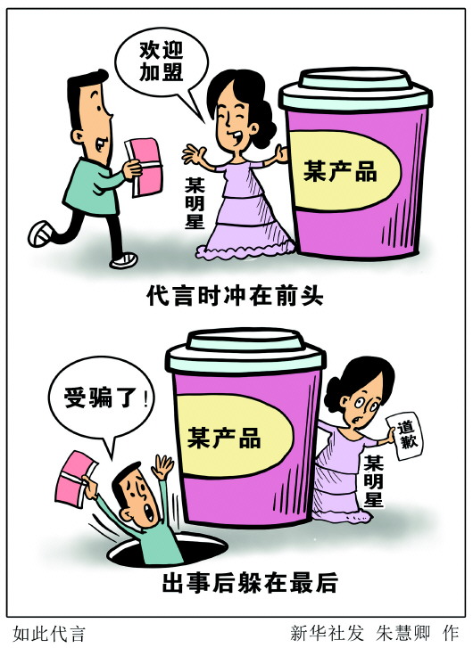 法律界人士认为,明星代言并非拿钱刷脸的“一锤子买卖”,而应事前详尽调查风险因素、事中及时跟进产品问题。