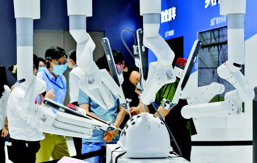 5月20日,在天津梅江会展中心,参观者在观看手术机器人展示。新华社记者赵子硕摄 |