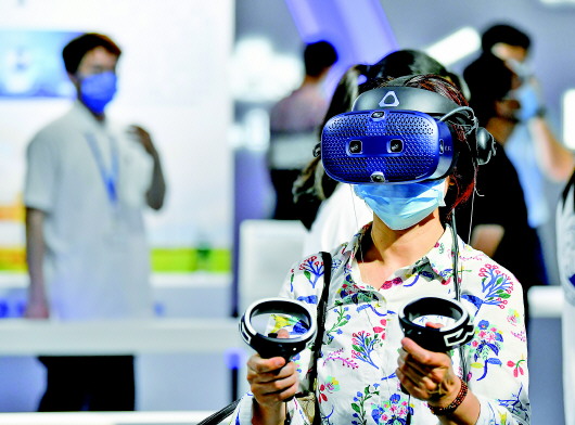 5月20日,在天津梅江会展中心,参观者体验无人机VR智慧教学系统。新华社发(孙凡越摄) |